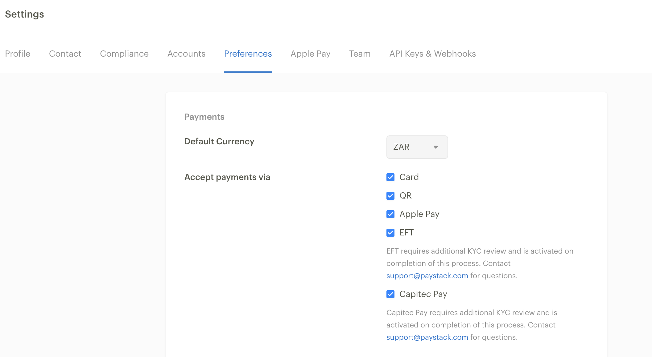 EFT and Captiec Pay require an additional KYC review. If your business has recently gone live, please allow for 3 business days for the method to appear in the checkout or contact support@paystack.com for assistance.