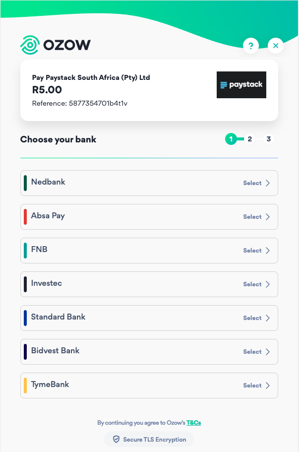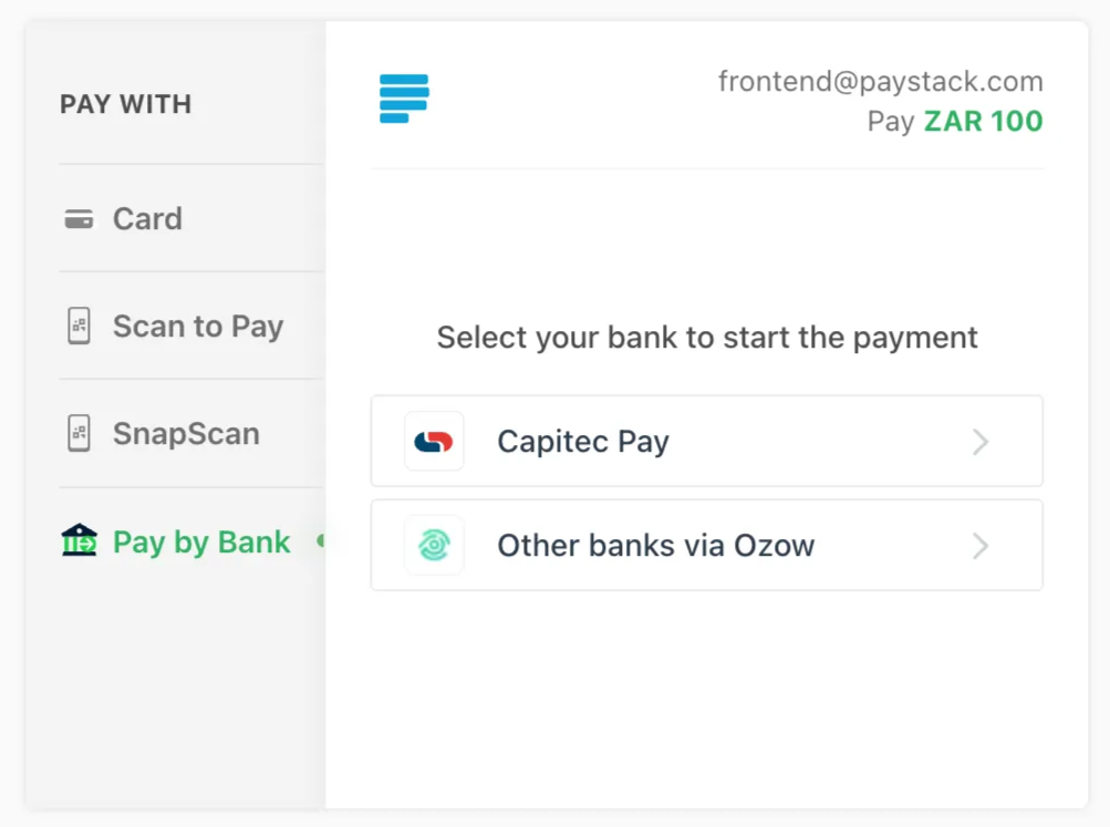 Paystack has an integration with Ozow, an EFT payment provider, to enable South Africa-based businesses to accept payments through.