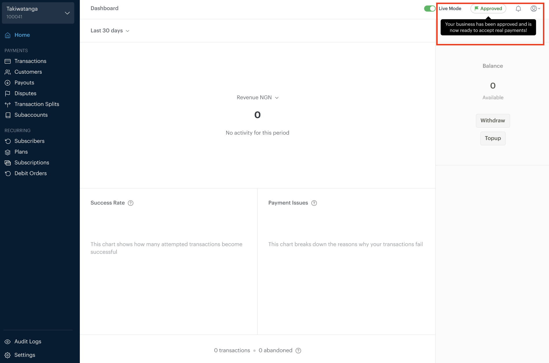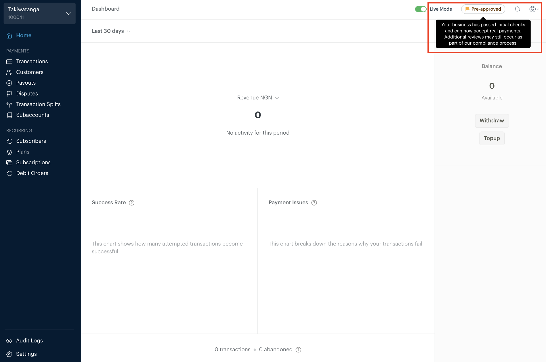 This status means your business has passed our initial compliance checks and you can start accepting real payments from your customers immediately.