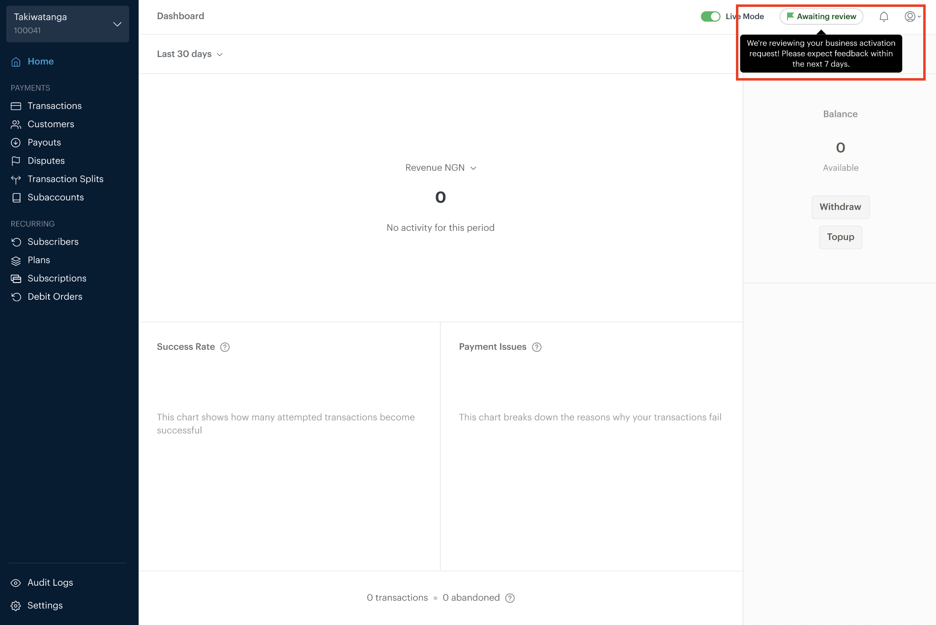 Once you submit your business activation request, our Compliance Reviews team reviews your information to ensure your business is ready to process payments securely. You can track the progress of your activation directly from your dashboard through your Activation Status.